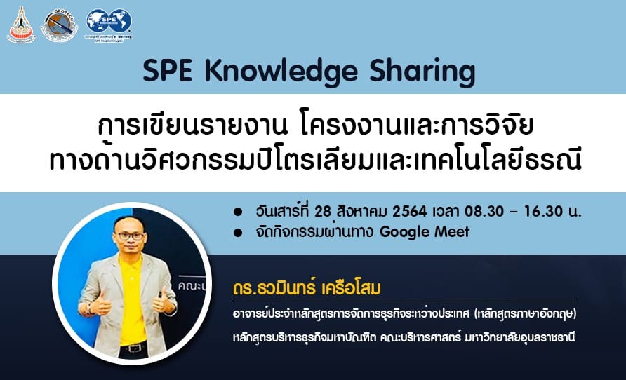 ขอเชิญนักศึกษาทุกชั้นปีเข้าร่วมฟังบรรยาย “การเขียนรายงาน โครงงานและการวิจัย ทางด้านวิศวกรรมปิโตรเลียมและเทคโนโลยีธรณี” โดย ดร.ธวมินทร์ เครือโสม อาจารย์ประจำหลักสูตรการจัดการธุรกิจระหว่างประเทศ (หลักสูตรภาษาอังกฤษ) คณะบริหารศาสตร์ มหาวิทยาลัยอุบลราชธานี